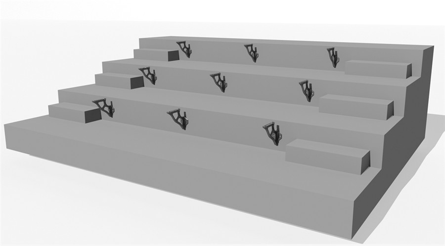 1)量出需要安裝座椅的區段的尺寸,一般是指固定看臺踏步通道與踏步通道之間的區間,然后對照設計圖紙,看需要多少個支架腿,分布好(FrogSport)。